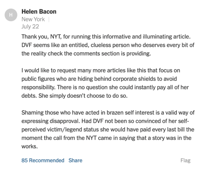 In their sheer accumulation, these comments become the real news story, bringing the blunt reality of DVF’s way of doing business to light. While the headline of the article reads, “Diane von Furstenberg’s Brand Is Left Exposed by the Pandemic,” nobody in the comment section is lamenting the degradation of the DVF brand. The hundreds of comments nearly unanimously condemn her selfishness in the face of COVID-19. The preponderance of this view is so strong that, rather than raising the same issue again, some comments simply call attention to this accumulation of remarks taking DVF to task: