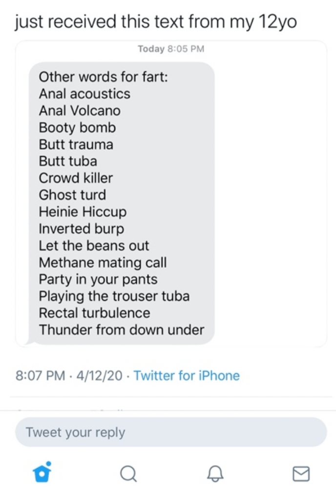 First of all: Ew! Moving beyond that initial reaction, I showed this tweet to my 13-year-old daughter and she was very impressed! She was also slightly baffled: How did this kid come up with all these different expressions? My daughter and I shared a moment of wonderment (and horror) at this mini fart thesaurus. Sometimes the language feats of teens carry an impressive ‘air’ of mystery and the unknown.