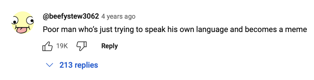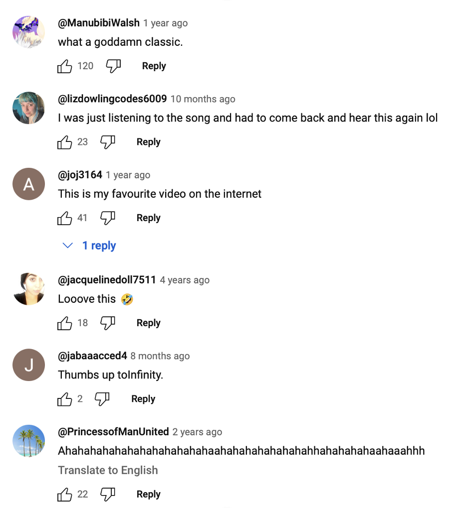 “Eso son Reebok o son Nike” is as a great example not only of a multilingual mondegreen, but also of how important it can be to give someone the benefit of the doubt when you are trying to figure out what they are saying. This DJ is such a generous listener. And he very satisfyingly guesses that the caller is requesting “This is the Rhythm of the Night.” Does this have the same absurd joyfulness as the monolingual Classic Rock mondegreen examples above? Judging by the reaction of the DJ, who ends up laughing spontaneously through the second half of the video, yes! And my students also expressed love for this example. Under the English translated YouTube version, the comments echo this enthusiasm: