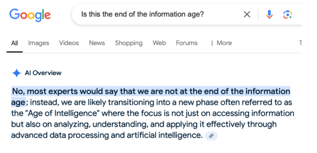 Does this mean the information age has ended? We used to worry that there is so much information out there that we won’t be able to distinguish what matters and what doesn’t. But now, we seem to have a more troubling problem. According to Google’s AI, to whom I humbly inquired, “Is this the end of the information age?”, we are now in the “Age of Intelligence”: