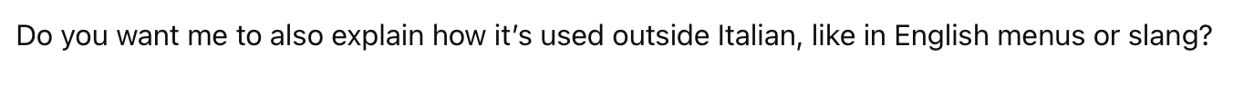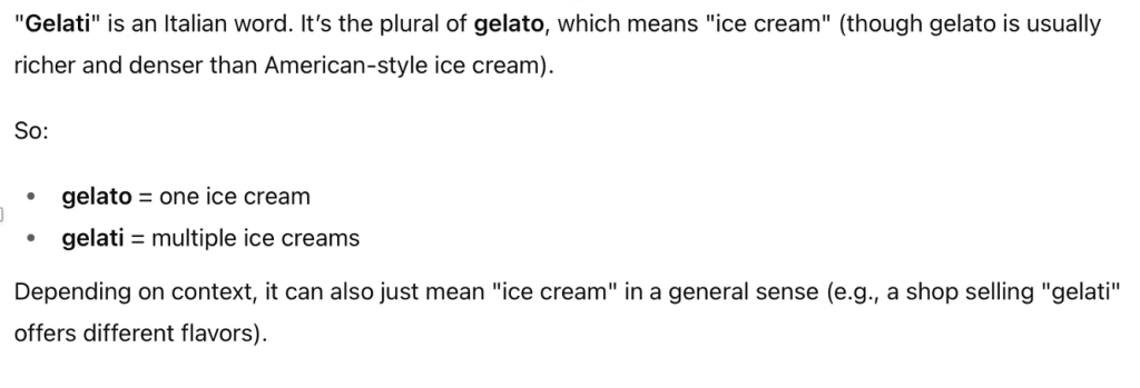 This sounds like ChatGPT might be catching on to the John’s Water Ice meaning of gelati. Was it? Here’s what followed: