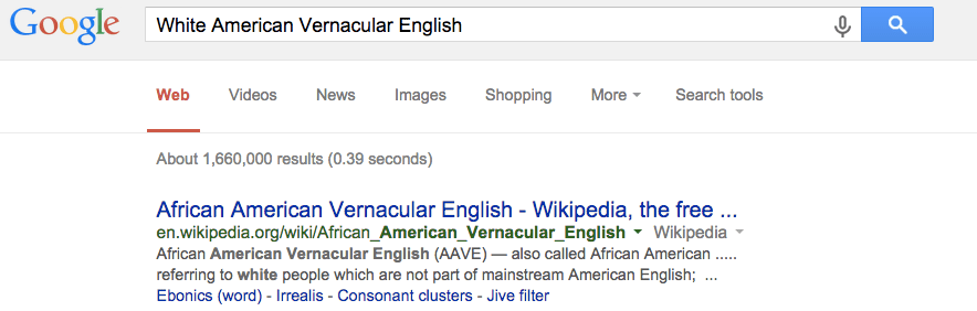 Try googling “White American Vernacular English” and guess what you get: